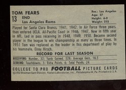 1952 Bowman Large Football Card (#13) of Los Angeles Rams Hall-of-Fame Wide Receiver, Tom Fears. Card is EX with some light corner wear and a crease along the right edge. See scan for centering.