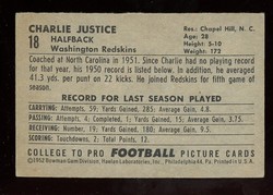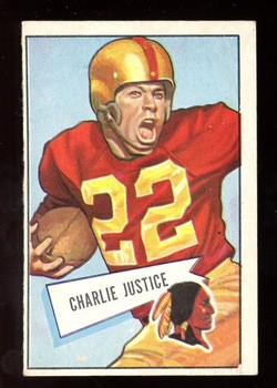 1952 Bowman Large Football Short Print Card (#18) of Washington Redskins Running Back, Charlie Justice. Card is EX- with some corner wear and no creases. Small surface scuff in the lower right. See scan for centering.