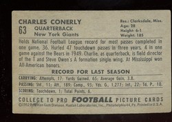 1952 Bowman Large Football Short Print Card (#63) of New York Giants Star Quarterback, Charlie Conerly. Card is VG-EX with some corner wear and creasing in the lower right. Small wax stain on back. See scan for centering.