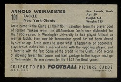 1952 Bowman Large Football Card (#101) of New York Giants Hall-of-Fame Tackle, Arnie Weinmeister. Card is EX+ with some corner wear and no creases. Ding in the upper left corner. Wax stain on back. See scan for centering.