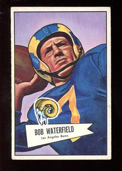 1952 Bowman Large Football Card (#137) of Los Angeles Rams Hall-of-Fame Quarterback, Bob Waterfield. Card is VG-EX with some corner wear and a light back crease in the lower right. Surface indentation along the bottom edge. Wax stain on back. Ding in the lower left corner. See scan for centering.