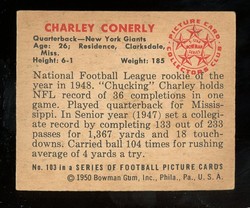 1950 Bowman Football Card (#103) of New York Giants Star Quarterback, Charley Conerly. Card is VG-EX with some corner wear and no creases. No writing, pin holes, tape stains. See scan for centering.