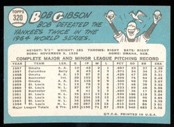 1965 Topps Baseball Card (#320) of St Louis Cardinals Hall-of-Fame Pitcher, Bob Gibson. Card is EX-MT+ with some light corner wear and no creases. No writing, pin holes, tape stains. See scan for centering.