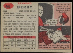 1957 Topps Football Rookie Card (#94) of Baltimore Colts Hall-of-Fame Wide Receiver, Ray Berry. Card is EX-MT+ with some light corner wear and no creases. See scan for centering.