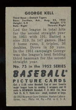 1952 Bowman Baseball Card (#75) of Detroit Tigers Hall-of-Fame 3rd Baseman, George Kell. Card is EX with some corner wear and no creases. See scan for centering.
