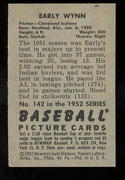 1952 Bowman Baseball Card (#142) of Cleveland Indians Hall-of-Fame Pitcher, Early Wynn. Card is EX-MT+ with some light corner wear and no creases. Light horizontal print line. See scan for centering.