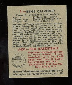 1948 Bowman Basketball Rookie Card (#1) of Providence Steamrollers Forward, Ernie Calverley. Card is EX- with some corner wear and a light back crease. No writing, pin holes, tape stains. See scan for centering.
