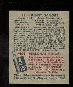 1948 Bowman Basketball Rookie Card (#12) of Providence Steamrollers Forward, Kenny Sailors. Card is EX-MT with some light corner wear and no creases. No writing, pin holes, tape stains. See scan for centering.