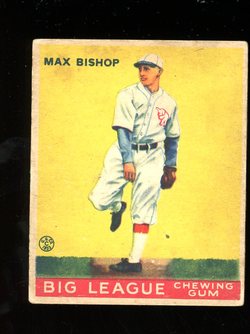 1933 Goudey Baseball Card (#61) of Philadelphia A's Infielder, Max Bishop. Card is VG-EX with some corner wear and a surface crease. See scan for centering.