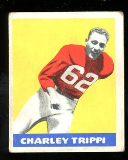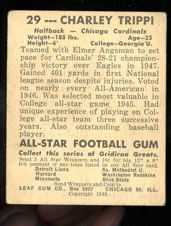 1948 Leaf Football Rookie Card (#29) of Chicago Cardinals Hall-of-Fame Running Back, Charley Trippi. Card is VG-EX with some corner wear/dings and a corner crease in the upper left. See scan for centering.