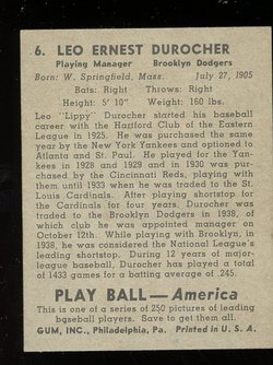 1939 Play Ball Baseball Card (#6 - Name in Upper Case) of Brooklyn Dodgers Manager, Leo Durocher. Card is EX with some light corner wear and no creases. No writing, pin holes, writing. Light surface wrinkle. See scan for centering.