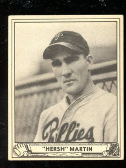 1940 Play Ball Baseball Card (#100) of Philadelphia Phillies Outfielder, Hersh Martin. Card is EX+ with some corner wear and no creases. See scan for centering.