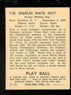1940 Play Ball Baseball Card (#118) of New York Yankees Hall-of-Fame Pitcher, Waite Hoyt. Card is VG-EX with some corner wear and a corner crease in the lower left.Small rubber band bend on top edge. See scan for centering.