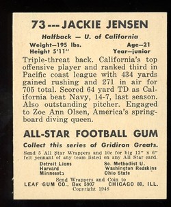 1948 Leaf Football Rookie High # Rookie Card (#73) of Boston Red Sox Star, Jackie Jensen. Card is EX-MT+ with some light corner wear and no creases. See scan for centering.