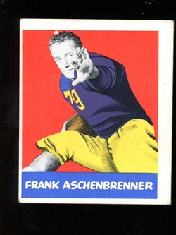 1948 Leaf Football Rookie High # Card (#93) of Frank Aschenbrenner. Card is EX- with some corner wear and a light back crase in the upper left. See scan for centering. Ding in the lower left corner.