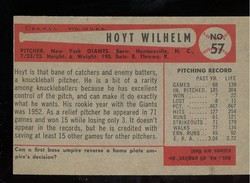 1954 Bowman Baseball Card (#57) of New York Giants Hall-of-Fame Pitcher, Hoyt Wilhelm. Card is EX-MT+ with some light corner wear and no No writing, pin holes, tape stains. See scan for centering.