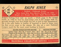 1953 Bowman Color Baseball Card (#80) of Pittsburgh Pirates Hall-of-Fame Outfielder, Ralph Kiner. Card is EX-MT with some light corner wear and no creases. No pin holes, tape stains. Small ding in the lower right corner. See scan for centering.