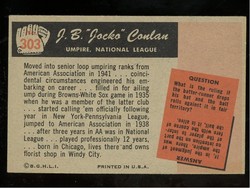 1955 Bowman Baseball High Number Card (#303) of Hall-of-Fame National League Umpire, JB Jocko Conlan. Card is EX+ with some corner wear and no creases. No writing, pin holes, tape stains. Ding in the upper right corner. See scan for centering.