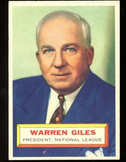 1956 Topps Baseball Card (#2 - Grey Back) of Former National League President, Warren Giles. Card is EX-MT with some corner wear and no creases. No writing, pin holes, tape stains. See scan for centering.