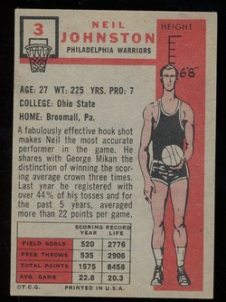 1957 - 1958 Topps Basketball Rookie Card (#3) of Philadelphia Warriors Hall-of-Fame Forward, Neil Johnston. Card is EX+ with some corner wear and no creases. No writing, pin holes, tape stains. See scan for centering.