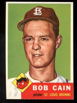 1953 Topps Baseball High Number Short Print Card (#266) of former St Louis Browns Pitcher, Bob Cain. Card is EX-MT with some corner wear and no creases. No writing, pin holes, tape stains. Small ding in the upper left corner. See scan for centering.