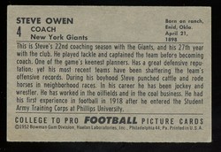 1952 Bowman Large Football Rookie Card (#4) of New York Giants Hall-of-Fame Coach, Steve Owen. Card is EX with some corner wear/dings and a faint corner crease in the lower right. See scan for centering.