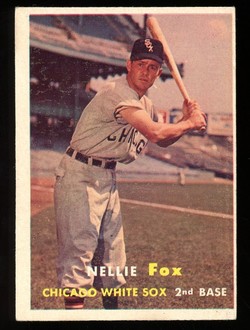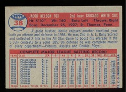 1957 Topps Baseball Card (#38) of Former Chicago White Sox All-Star 2nd Baseman, Nellie Fox. Card is VG-EX with some corner wear and a light back crease. No writing, pin holes, tape stains. See scan for centering