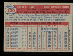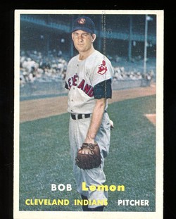 1957 Topps Baseball Card (#120) of Cleveland Indians Hall-of-Fame Pitcher, Bob Lemon. Card is EX-MT+ with some light corner wear and no creases. No writing, pin holes, tape stains. See scan for centering