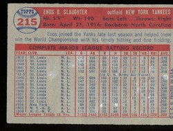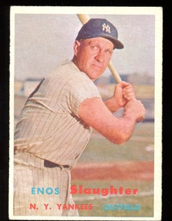 1957 Topps Baseball Card (#215) of New York Yankees / St Louis Cardinals Hall-of-Fame Outfielder, Enos Country Slaughter. Card is EX+ with some corner wear and no creases. No writing, pin holes, tape stains. Small ding in the upper right corner. See scan for centering