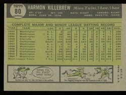 1961 Topps Baseball Card (#80) of Minnesota Twins Hall-of-Fame 3rd Baseman, Harmon Killebrew. Card is EX-MT with some corner wear and no creases. No writing, pin holes, tape stains. See scan for centering.