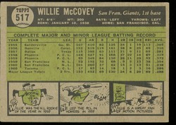 1961 Topps Baseball Card (#517) of n Francisco Giants Hall-of-Fame 1st Baseman, Willie McCovey. Card is EX with some corner wear and a light back crease in the lower left. No writing, pin holes, tape stains. See scan for centering.