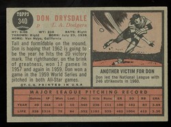 1962 Topps Baseball Card (#340) of Los Angeles Dodgers Hall-of-Fame Pitcher, Don Drysdale.