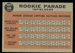 1962 Topps Baseball Rookie Parade High Number Short Print Rookie Card (#596) featuring former New York Yankees Joe Pepitone and Phil Linz. Also features Rich Rollins (Twins) and Bernie Allen (Twins)