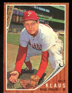 1962 Topps Baseball Short Print High Number Card (#571) of former Philadelphia Phillies Infielder, Billy Klaus.