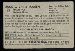 1952 Bowman Football Rookie Card (#129) of Detroit Lions Hall-of-Fame Running Back, Jack Christiansen. Card is VG-EX with some corner wear and a crease in the lower left conrer. See scan for centering.