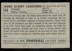 1952 Bowman Small Football Rookie Card (#144) of Dallas Texans Tackle, Jim Lansford. Card is EX+ with some corner wear and no creases. Small rubber band bend on left edge. See scan for centering.