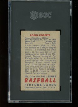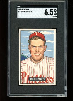 1951 Bowman Baseball Card (#3) of Philadelphia Phillies Hall-of-Fame Pitcher, Robin Roberts. Card is graded 6.5 EX-MT+ (Excellent to Mint Plus) by SGC.