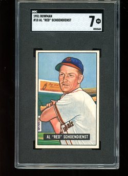 1951 Bowman Baseball Card (#10) of St Louis Cardinals Hall-of-Fame 2nd Baseman, Red Schoendienst. Card is graded 7 NM (Near Mint) by SGC.