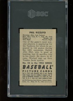 1952 Bowman Baseball Card (#52) of New York Yankees Hall-of-Fame Shortstop, Phil Rizzuto. Card is graded 6 EX-MT (Excellent to Mint) by SGC.