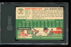 1954 Topps Baseball Card (#20) of Milwaukee Braves Hall-of-Fame Pitcher, Warren Spahn. Card is professionally graded 5.5 EX+ (Excellent Plus) by SGC.