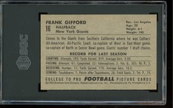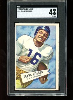 1952 Bowman Large Football Rookie Card (#16) of New York Giants Hall-of-Fame Running Back, Frank Gifford. Card is professionally graded 4 VG-EX (Very Good to Excellent) by SGC.