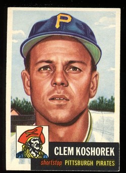 1953 Topps Baseball Card (#8) of former Pittsburgh Pirates Shortstop, Clem Koshorek. Card is EX-MT with some corner wear and no creases. No writing, pin holes, tape stains. Small ding in the lower right corner. See scan for centering.