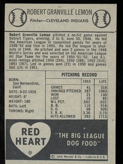 1954 Red Heart Dog Food Baseball Bob Lemon Cleveland Indians HOF