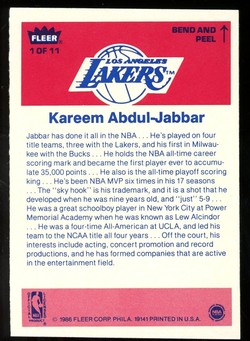 1986 - 1987 Fleer Basketball Sticker Card (#1) of Los Angeles Lakers Hall-of-Fame Center, Kareem Abdul Jabbar. Card is EX-MT with some corner wear and no creases. No writing, pin holes, tape stains. Slight diamond cut. See scan for centering.