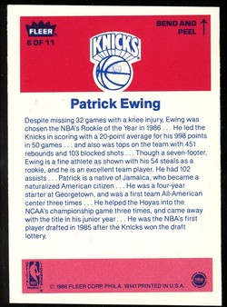 1986 - 1987 Fleer Basketball Sticker Card (#6) of New York Knicks Hall-of-Fame Center, Patrick Ewing. Card is NM with some corner wear and no creases. No writing, pin holes, tape stains. Slight diamond cut. See scan for centering.