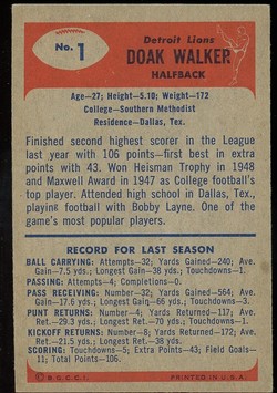 1955 Bowman Football Card (#1) Of Detroit Lions Hall-of-Fame Running Back, Doak Walker.