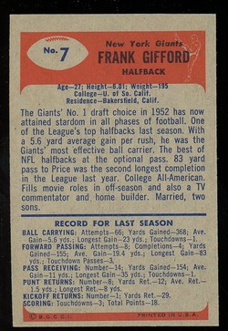 1955 Bowman Football Card (#7) Of New York Giants Hall-of-Fame Running Back, Frank Gifford.