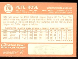 1964 Topps Baseball Card (#125) of former Cincinnati Reds All-Star, Pete Rose. Card is EX-MT with some corner wear and no creases. No writing, pin holes, tape stains. Faint print line along the left edge. See scan for centering.