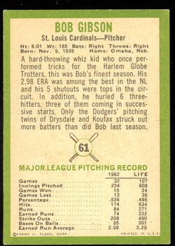 1963 Fleer Baseball Card (#61) of St Louis Cardinals Hall-of-Fame Pitcher, Bob Gibson. Card is EX with some corner wear/dings and no creases. No writing, pin holes, tape stains. Small ding in the upper left corner. See scan for centering.
