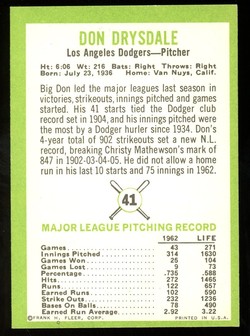 1963 Fleer Baseball Card (#41) of Los Angeles Dodgers Hall-of-Fame Pitcher, Don Drysdale.